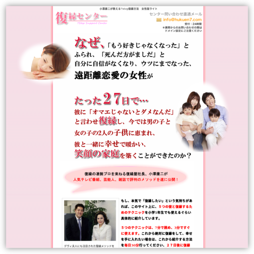 探偵も様々ありますが、その中には復縁を依頼できるところもあると聞いています。何がなんでも以前交際していた相手と復縁したいと言うなら、その道のプロフェッショナルのお世話になるのも有益な手段です。